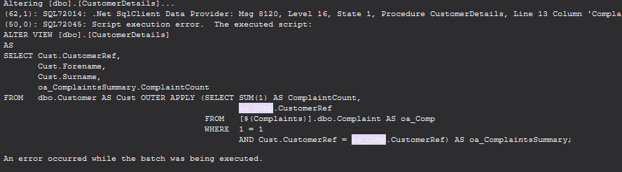 Once I’d done that I thought everything would be fine so I generated another deployment script. Turns out there was one more little thing. When the SQL Server engine generated the object definition for those checks, it ordered the different predicates according to where they were in the original IN predicate, from last to first, which gives definitions like this:
