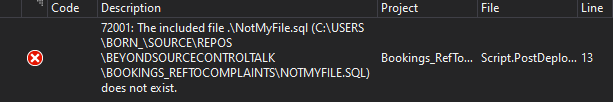 That all looks ok, and everything published fine, and kept on publishing fine until I happened to check the generated script for some of the publishes (I was in the early stages of development at this point so deployments were just being done through Visual Studio direct to my machine).